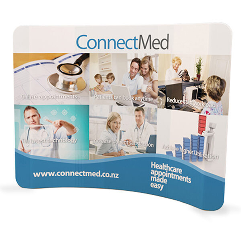 Concave, crescent-shaped full-sized trade show display with 100% of its surface dedicated to your graphic presentation. The display graphic is made of a stretchable, pillowcase-style, wrinkle-free fabric that simply slips over the tubular aluminum frame and zips shut on one side. The tubular aluminum frame sections simply button-snap together. The large-format printing method is dye-sublimation.