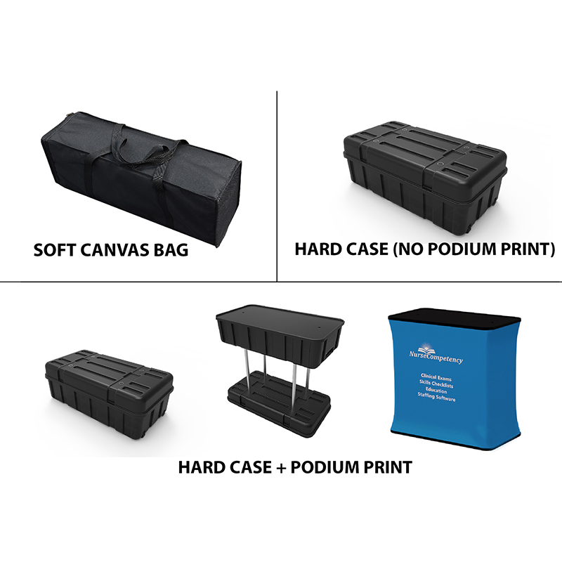 “Two-Displays-in-One“: The 10′-wide display graphic can be single-sided or it can also be printed on the reverse side for a second presentation option. The double-sided option is useful when exhibiting in front of different audiences or promoting different products or varying seasonal services. Graphics are more noticed and most compelling when illuminated with two optional LED light fixtures (highly recommended). This display packs into a soft-sided zipper carry bag. If a more protective, hard-sided shipping case with wheels is required, that option also can include a graphic case cover that converts the empty case into a functional, rectangular, branded, graphically-pleasing counter.