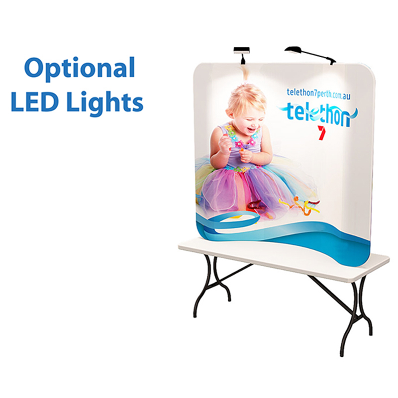 A perfect choice for smaller events, recruitment fairs, Chamber of Commerce events and when exhibitors will be in close proximity to the audience. Great substitute when a full-sized 10-foot wide display is not necessary or appropriate. Popular with college admissions and HR recruiters. Can become "two-displays-in-one" by printing on opposite side for a totally reversible graphic option. Concerning weight and convenience of traveling and transporting this tabletop display, this it the lightest 6'-wide tabletop exhibit on the market: 15 lbs. Enhance your graphics by requesting the LED lighting kit, comprised of two fixtures to attract the ultimate attention to your exhibit and become more compelling to your audience. Protective plastic transportation case with wheels available as an option.