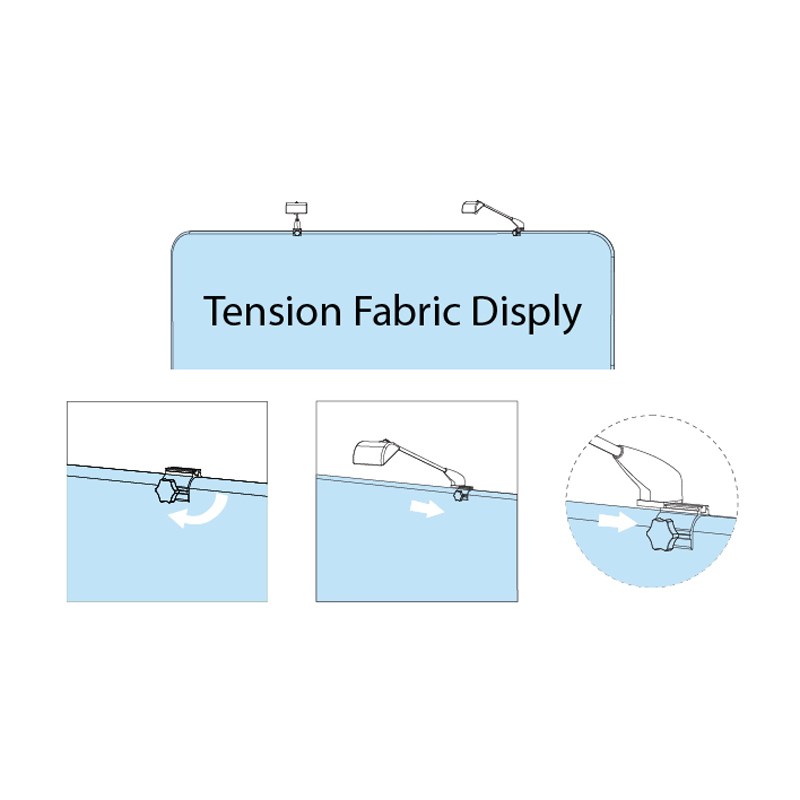 - For tension fabric displays, use the connector included with the display to install the lights. For fabric pop up displays, no additional hardware is needed: Simply slide the light fixture on to the bracket for fabric pop-up displays.